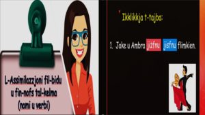 Preżentazzjoni u taħriġ dwar l-assimilazzjoni fil-bidu u n-nofs tal-kelma tan-nomi u l-verbi għall-Ħames Sena tal-Primarja.  Nirringrazzjaw lil Josette Baldacchino li ħejjiet dawn ir-riżorsi.